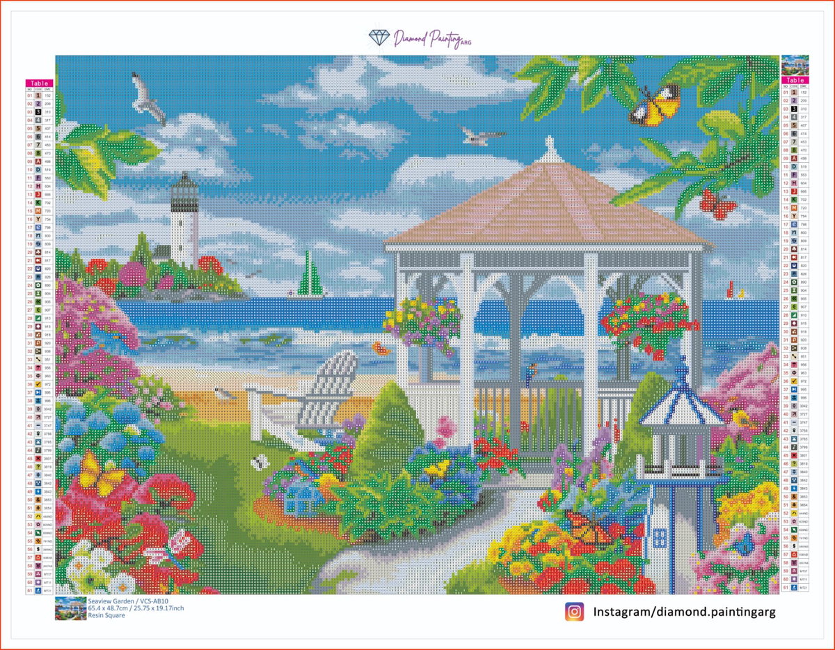 Escapa a un mundo de serenidad con este lienzo de diamond painting. La escena costera con gazebo, flores y un faro te transportará a un lugar de tranquilidad y relajación. Cada diamante brilla con luz propia, dando vida a esta obra de arte.