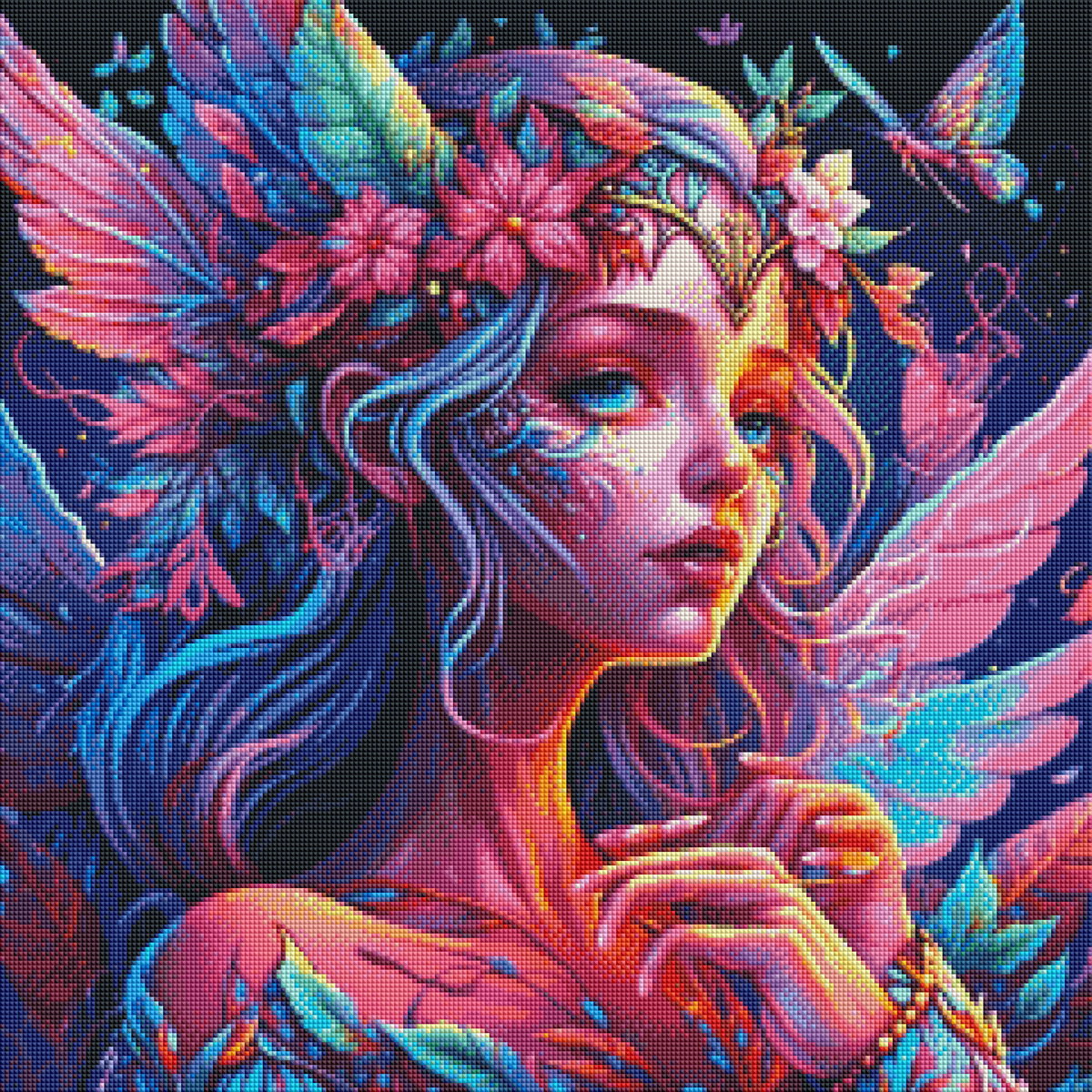 Este lienzo de diamond painting es una obra de arte mágica que te transportará a un mundo de fantasía y belleza ✨. La imagen muestra a una hada con alas delicadas y un cabello adornado con flores vibrantes, creando una sensación de elegancia y misterio 💫.