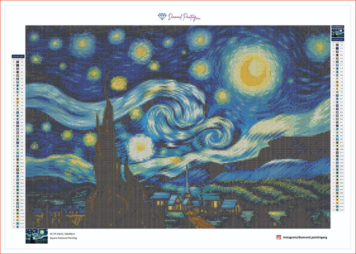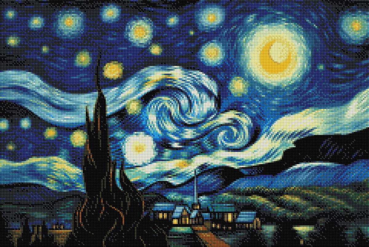 Experimenta la magia de la obra maestra de Vincent van Gogh en este lienzo de diamond painting. Este kit te permite recrear la icónica escena nocturna con estrellas brillantes y un cielo remolineante.