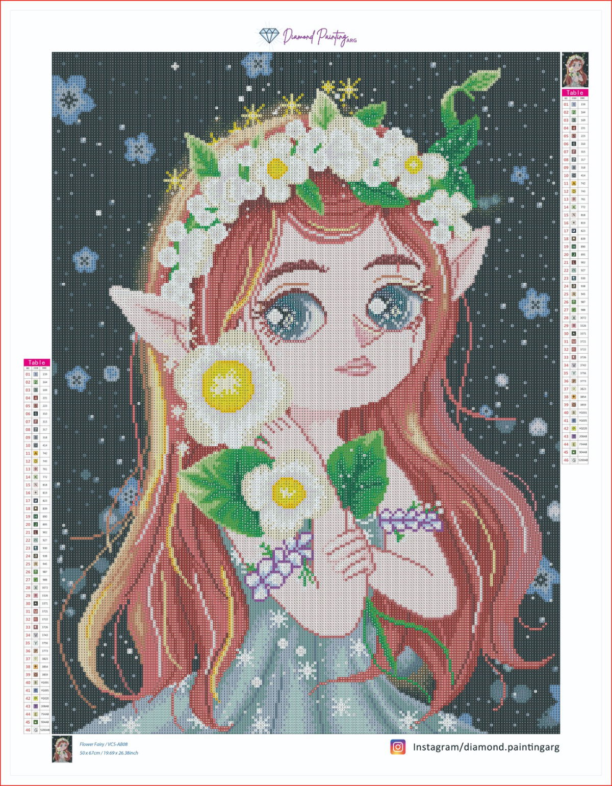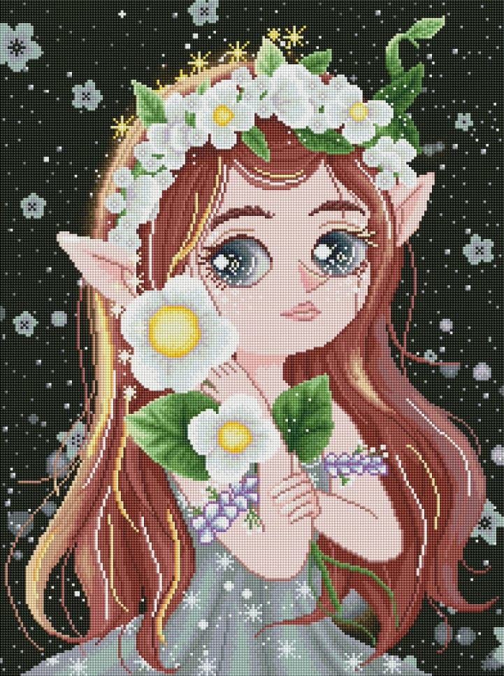Lienzo de diamond painting con diseño exclusivo de una elfa con cabello rojizo, ojos brillantes y corona de flores blancas. Incluye todo: lienzo adhesivo, diamantes de resina y herramientas.